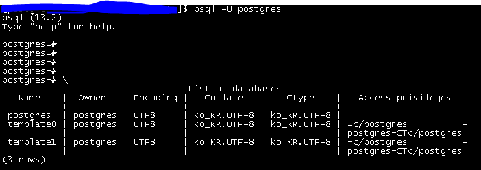이 데이터베이스에는 postgresql 유저정보, Database 정보, 스키마 정보 등 모든 카탈로그 정보들이 포함되어 있다. postgres 계정으로 생성한다.